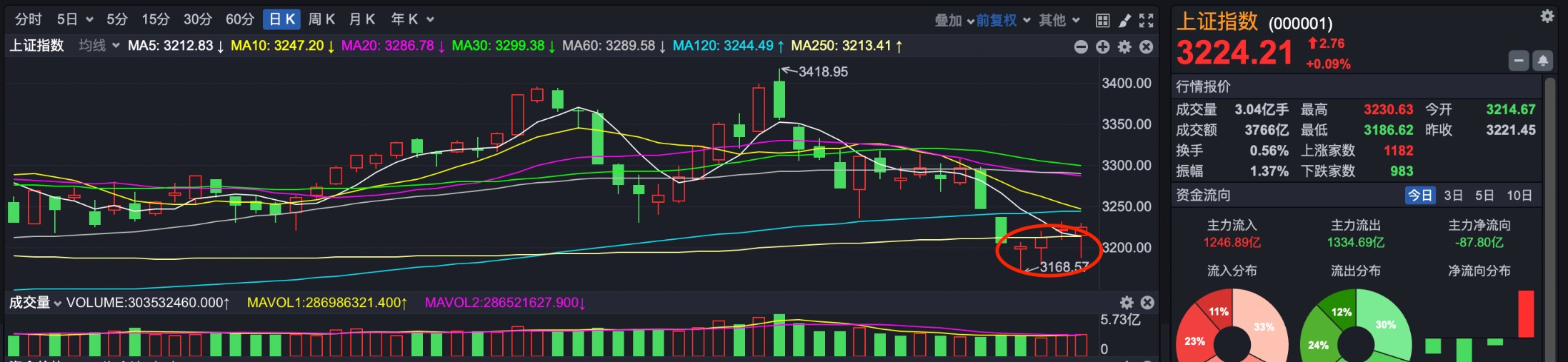今天,市场一度低迷,沪指最多下跌超过30点,不过午后迎来V型反转,各类指数全线翻红。最终,沪指小涨2.76点,以3224.21点报收,再次守住年线关口。