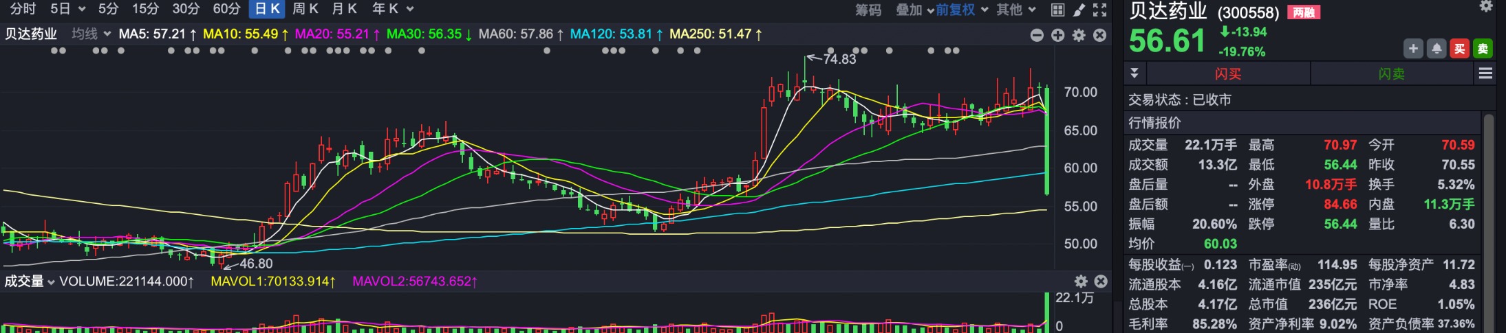 不过,今天依然有一些基金重仓股出现大跌。比如创新药龙头贝达药业,今天大跌超过19%。