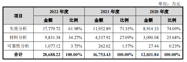 2020-2022年(以下简称“报告期”),胜科纳米失效分析业务检测服务的销售收入分别为8914.33万元、1.19亿元和1.77亿元,占主营业务收入的比重分别为74.09%、71.35%和61.98%,是公司主要的检测服务项目。