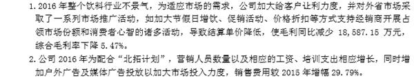 对于营收的下降,天地壹号自己的解释是:因整个饮料行业不景气进而加大促销力度,导致结算单价降低,营收减少。