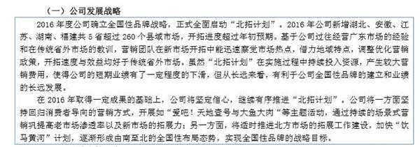 因2016年度财报未披露具体地区销售额占比情况,故无法对“北拓计划”成效下准确定论,但从天地壹号2016年报将销售市场相对集中列为风险因素来看,销售市场仍主要集中于广东省内,短期成效可见一斑。
