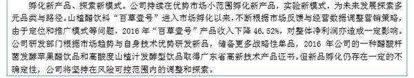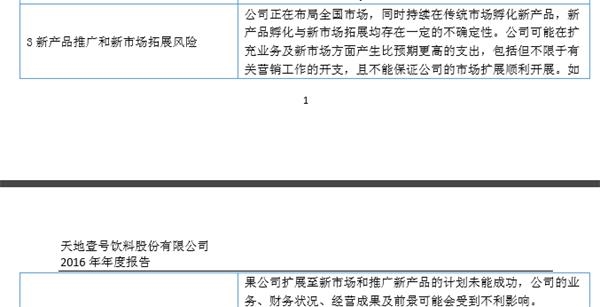 除了“北拓计划”,天地壹号在2016年做的另一件大事就是,孵化新产品。相似的是,新产品与新市场拓展均被列为风险因素。