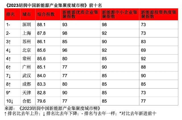 6月19日发布的《2023胡润中国新能源产业集聚度城市榜》显示,深圳、上海、苏州位列前三,北京、常州则并列第四,广州、武汉、成都、天津和合肥分列6-10位。