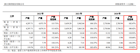 国祥股份招股书还披露,2020年、2021年,公司产能利用率超100%,2022年公司主要工序除喷涂工序外,产能利用率均超100%,四项主要工序产能利用率超110%。国祥股份常年超产能生产,是否环保、安全生产等相关规定?国祥股份并未说明。