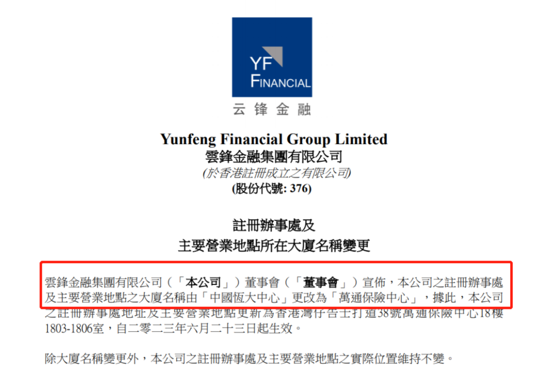 6月23日,H股上市公司云锋金融(00376,HK)发布了注册办事处及主要营业地点所在大厦名称变更的公告,大厦名称由“中国恒大中心”更改为“万通保险中心”。