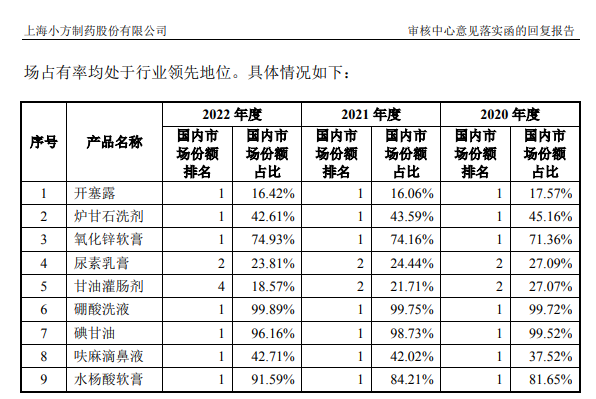 此外,小方制药招股书披露还存在自相矛盾之外。公司引用米内网数据显示,2020年至2022年,国内开塞露市场规模约7.677亿元、9.08亿元和9.83亿元。小方制药市场份额分别为17.57%、16.06%和 16.42%。由此推算,2020年至2022年,小方制药开塞露销售额约为1.348亿元、1.458亿元和1.614亿元。但招股书又披露,上述年度,小方制药开塞露销售额1.97亿元、2.04亿元和2.31亿元,这与对应的市场份额并不一致,小方制药并未解释上述差异的原因。