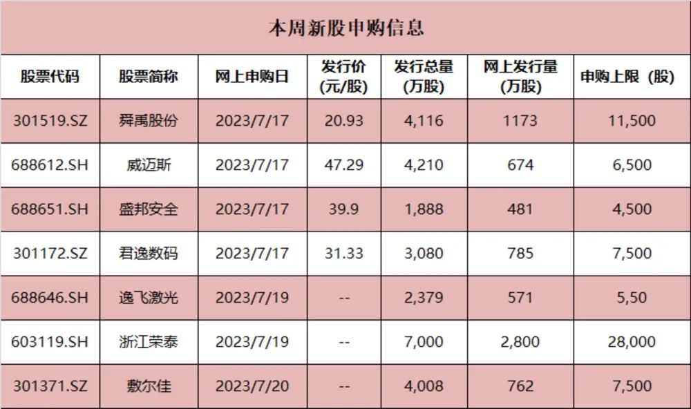 本周(7月17日—7月21日),共有7只新股将进行申购,其中创业板3只(舜禹股份、君逸数码、敷尔佳),科创板3只(威迈斯、盛邦安全、逸飞激光),沪市主板1只(浙江荣泰)。