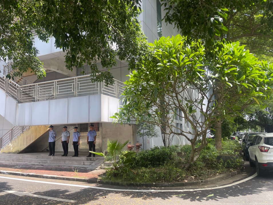 澎湃新闻记者看到,中炬高新百余名保安围绕会展中心,除了巡逻的保安队,会展中心东西南北四个方向的每个门都有两名以上保安看守,其中以正门最多,有20余人。