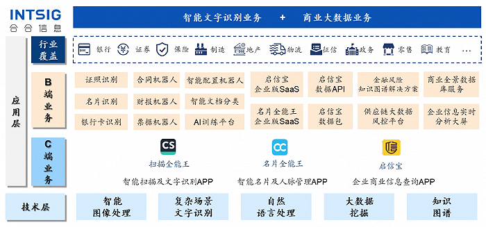 据悉,合合信息C端业务主要为面向全球个人用户的APP产品,包括扫描全能王(智能扫描及文字识别APP)、名片全能王(智能名片及人脉管理APP)、启信宝(企业商业信息查询APP)3款核心产品;公司B端业务为面向企业客户提供以智能文字识别、商业大数据为核心的服务,形成了包括基础技术服务、标准化服务和场景化解决方案的业务矩阵,满足客户降本增效、风险管理、智能营销等多元需求,助力客户实现数字化与智能化的转型升级。