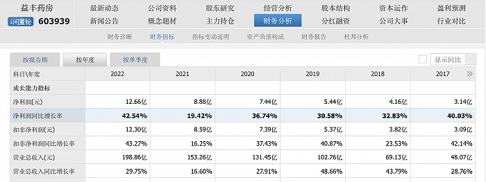 益丰药房成立于2008年6月20日,2015年2月17日上市,控股股东宁波梅山保税港区厚信创业投资合伙企业(有限合伙),实际控制人高毅,也是公司董事长。益丰药房主营业务中西成药、中药饮片、医疗器械、保健食品、个人护理用品及与健康相关联的日用便利品等商品的连锁零售业务,数据显示,2022年和2023年一季度公司的营业收入分别是198.86亿元和52.66亿元,净利润分别是12.66亿元和3.36亿元。公司净利润常年保持着增长。