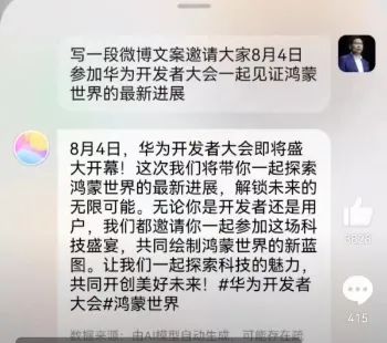 8月2日,余承东在微博分享视频,向用户“剧透”了最新版鸿蒙操作系统的一项重磅功能——AI大模型能力,可自动生成内容。