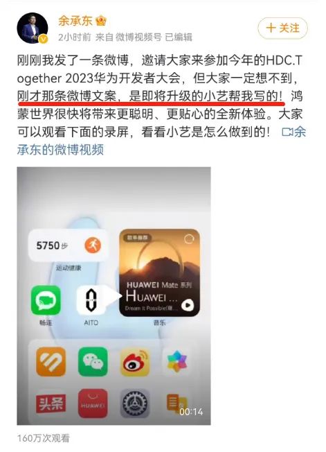“刚刚我发了一条微博,邀请大家来参加今年的HDC.Together 2023华为开发者大会,但大家一定想不到,刚才那条微博文案,是即将升级的小艺帮我写的!”余承东激动地表示。