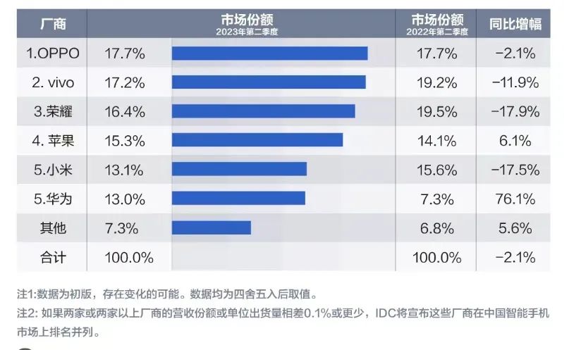 7月27日,数据研究机构IDC发布的“中国季度手机市场追踪报告”显示,今年第二季度,华为手机以13%的市场份额重回国内前五,与小米并列,并且创下了76.1%的同比增幅,大幅领先其他厂商。