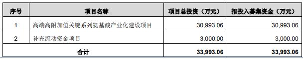 招股书显示,无锡晶海拟募集资金33993.06万元,分别用于高端高附加值关键系列氨基酸产业化建设项目、补充流动资金项目。
