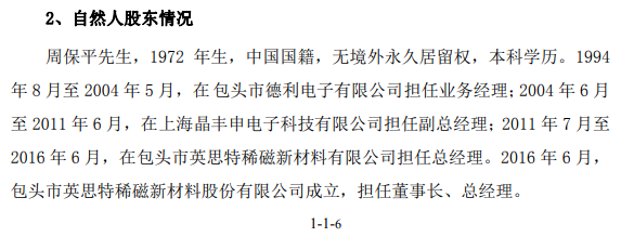 英思特原为在新三板挂牌的公司,后于2019年9月终止挂牌。根据该公司在2016年10月发布的《公开转让说明书》披露,实际控制人、董事长周保平此前于2004年6月至2011年6月在上海晶丰申电子科技有限公司担任副总经理,2011年7月开始担任英思特的总经理。但是在本次该公司IPO披露的招股书中则披露,周保平此前于2005年7月至2011年6月在上海晶丰申电子科技有限公司担任副总经理,2011年6月开始担任英思特的总经理。两次公开信息披露对于周保平供职于上海晶丰申电子科技有限公司的时间存在较大差异。