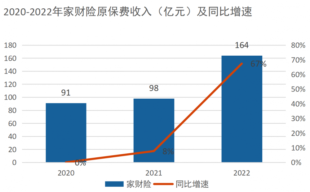 多地试水普惠型家财险的背后,是家财险需求的逐步释放。业内普遍认为,目前家财险在国内市场的渗透率还比较低,但是随着需求端关注度升温,以及险企对于非车险财险业务的发力,家财险未来市场潜力巨大。事实上,近年来,随着居民对于家庭财产保护意识的增强,家财险的保费迎来了大幅增长。根据国家金融监督管理总局数据,家财险2022年实现保费收入164亿元,较2021年同比增长67.22%,成为财产险增速最快的险种。