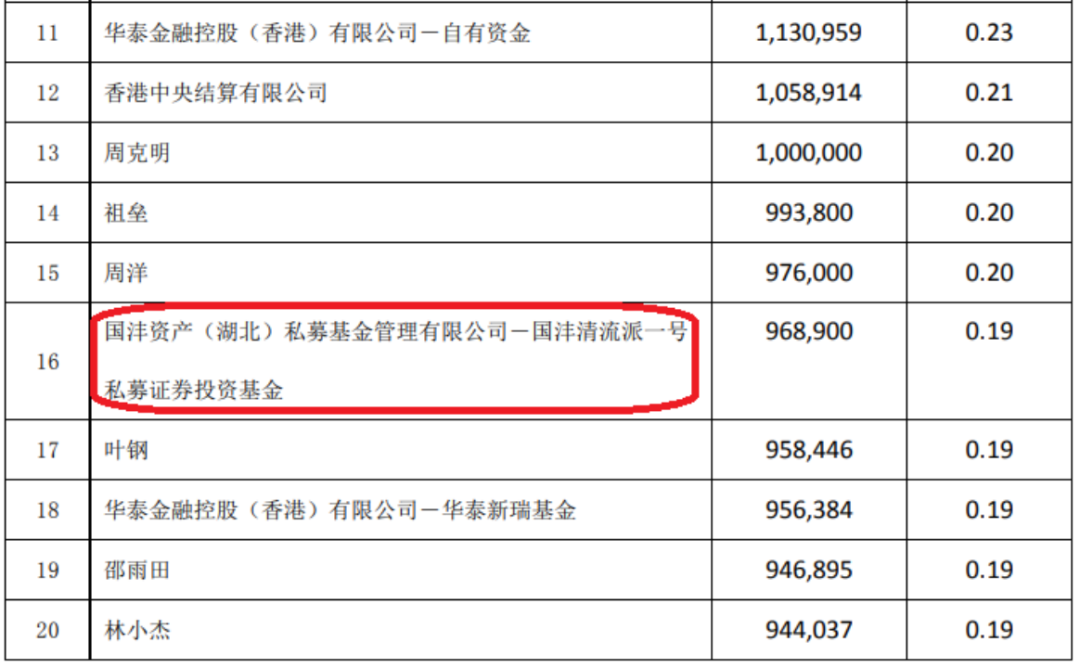 根据鸿博股份上述股东列表,截止6月20日,国沣资产旗下的国沣清流派一号为鸿博股份第16大股东,国沣华山一号为第9大股东。