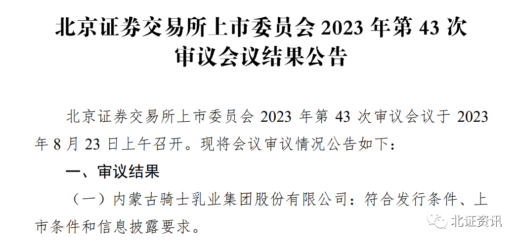 在今日召开的2023年第43次审议会议上,骑士乳业的审核结果为“符合发行条件、上市条件和信息披露要求”,这意味着,其已闯关成功。