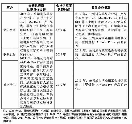 卓兆点胶表示,公司与主要客户皆有3年以上的合作历史,公司作为国内为数不多的通过苹果公司合格供应商认证的具备核心部件自研自产能力的点胶设备厂商,具备一定的市场地位;从苹果公司终端产品来看,公司点胶设备产品占据苹果产业链耳机点胶设备较高的市场份额,与苹果公司及其EMS厂商达成长期稳定的合作关系,在苹果产业链中点胶设备收入维持在较高水平。