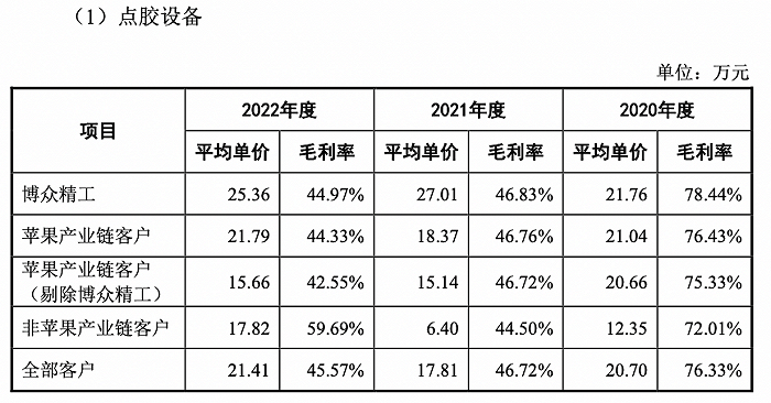 另外,报告期内,卓兆点胶向博众精工销售的点胶设备平均单价高于其他客户,公司解释称主要系对其销售的点胶设备自动化程度和精密程度更高,生产成本和技术附加值均较高,相应的销售定价亦较高,而销售毛利率方面差异较小。