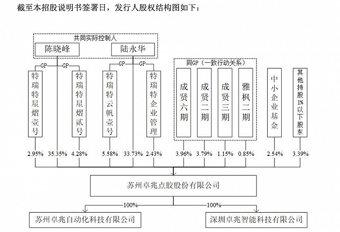 目前,陈晓峰和陆永华为卓兆点胶实控人,二人合计支配公司84.3145%的表决权,其中陈晓峰担任公司董事长、总经理,陆永华担任公司副董事长。