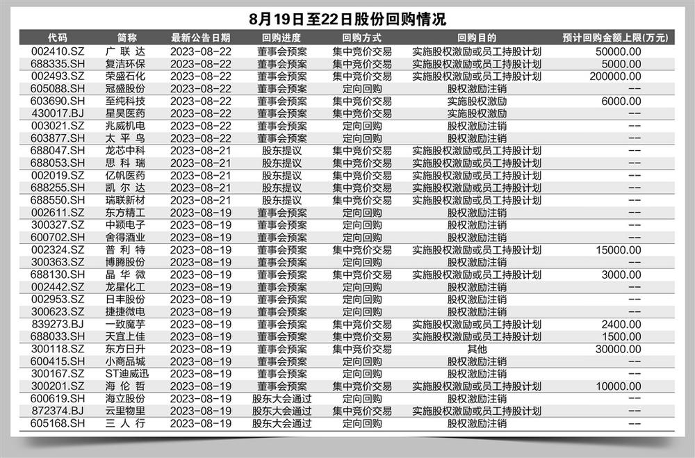 以8月22日披露的公告为例,有兆易创新、成大生物、中触媒等公司股东提议回购股份;花园生物、杰普特等公司首次披露回购预案;微光股份、太湖雪等公司公告回购实施进展;雅戈尔、先达股份、中亚股份公告已完成回购。