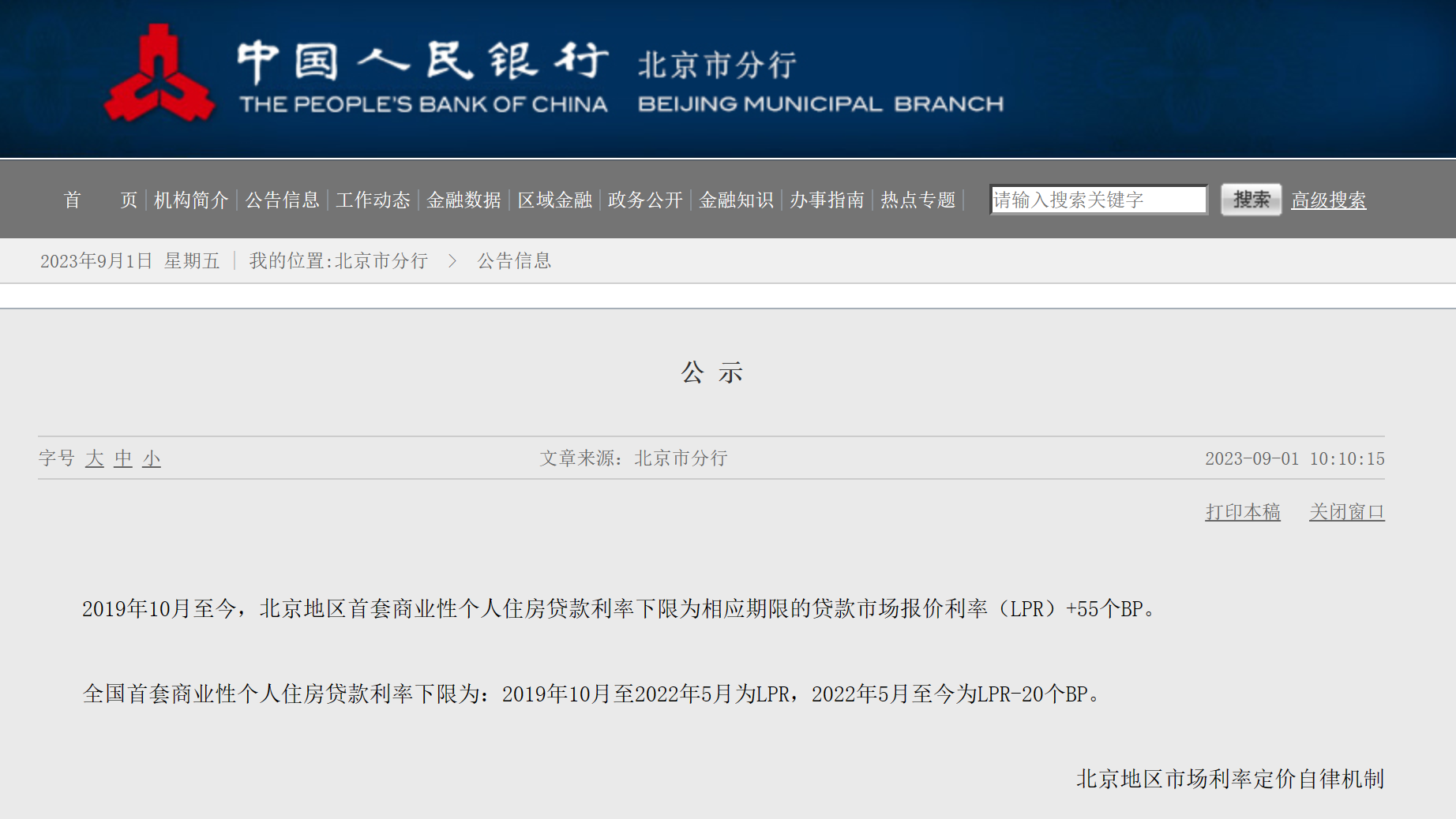 9月1日,中国人民银行北京市分行发布公示,2019年10月至今,北京地区首套商业性个人住房贷款利率下限为相应期限的贷款市场报价利率(LPR)+55个BP。