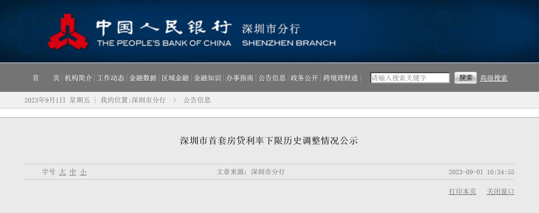 9月1日,中国人民银行深圳市分行对深圳市首套房贷利率下限历史调整情况进行公示。2019年10月8日至今,深圳市执行利率下限水平为LPR+30BP。