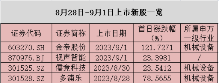 当周上市的4只新股首日表现延续了本月次新股的活跃走势,无一家出现破发。涨幅最高的是金帝股份(603270.SH),该股9月1日登陆上交所,发行价格21.77元/股,市盈率为41.68倍,报收48.27元/股,涨121.73%。