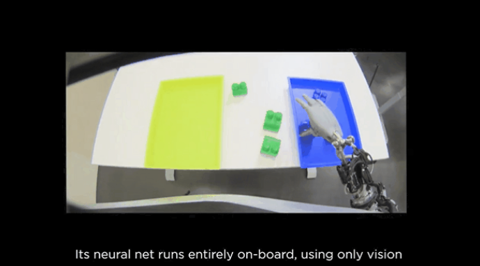 其将蓝色与绿色积木分别分拣到对应颜色的托盘之中,即便在抓取积木过程中,有人在一旁将积木打乱,Optimus也可以立即调整并适应新环境,继续分拣积木。与此同时,其还可以将翻倒的积木摆正,并执行“打乱分类好的积木”等新任务。