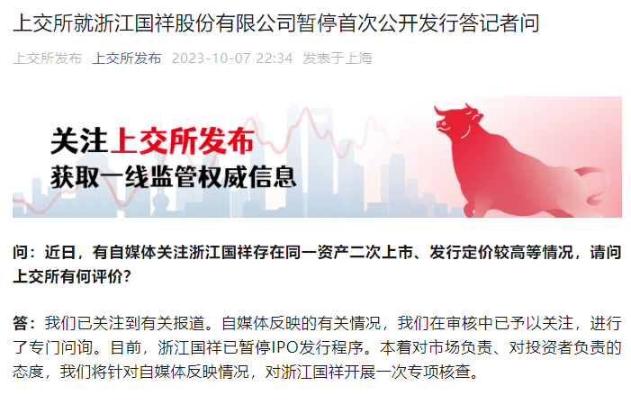 随后,A股拟上市公司浙江国祥公告,因有关媒体报道,为切实保护投资者利益,发行人及主承销商决定暂停后续发行工作,待有关事项得到核实与澄清后再继续发行工作。原《发行安排及初步询价公告》中披露的预计发行时间表将进行调整,原定于2023年10月9日(T日)进行的申购暂缓。
