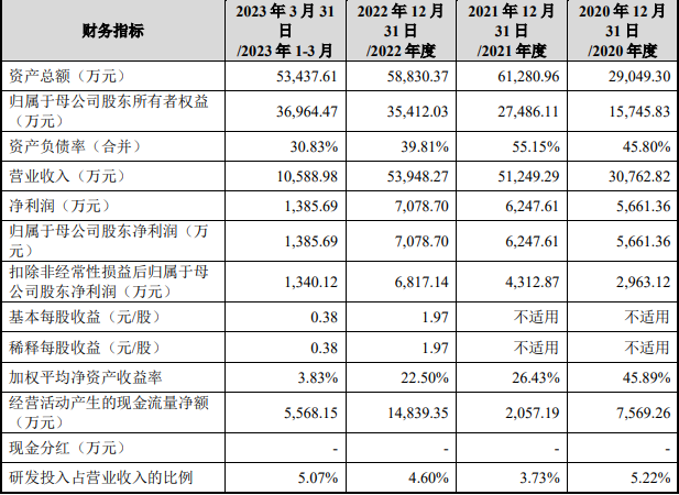 公司坚持以智能手机精密线圈的研发、设计、生产、销售作为核心业务,已发展成为高端智能手机精密线圈领域的领先企业,并已逐步将业务延伸至精密注塑、冲压及组装件(VCM 结构件及其他功能性精密电子零部件)领域,同时不断丰富公司产品的应用场景,持续拓展公司产品在智能穿戴、智能家居、汽车电子、安防、医疗等终端市场的应用空间。公司于2020年、2021年、2022年及2023年前三月分别实现营业收入3.08亿元、5.12亿元、5.39亿元及1.06亿元;分别实现归母净利润5661.36万元、6247.61万元、7078.7万元及1385.69万元。