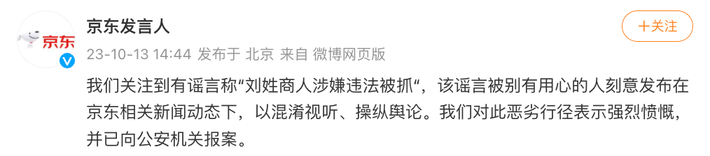 10月13日,@京东发言人发文称,我们关注到有谣言称“刘姓商人涉嫌违法被抓”,该谣言被别有用心的人刻意发布在京东相关新闻动态下,以混淆视听、操纵舆论。我们对此恶劣行径表示强烈愤慨,并已向公安机关报案。