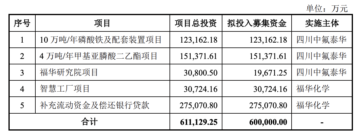 具体来看,60亿元资金中的12.3亿元,用于10万吨/年磷酸铁及配套装置项目;15.1亿元用于4万吨/年甲基亚膦酸二乙酯项目;3.01亿元用于福华研究院项目;而其中最大的一笔资金,27.5亿元用于补充流动资金及偿还银行贷款。