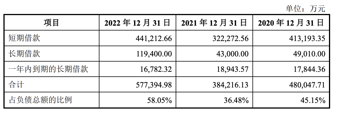 截至2022年12月31日,福华化学短期借款高达44.12亿元,长期借款11.94亿元,一年内到期的长期借款为1.68亿元,借款合计57.74亿元,占负债总额的比例为58.05%,而福华化学资产负债率(合并口径)为76.20%。