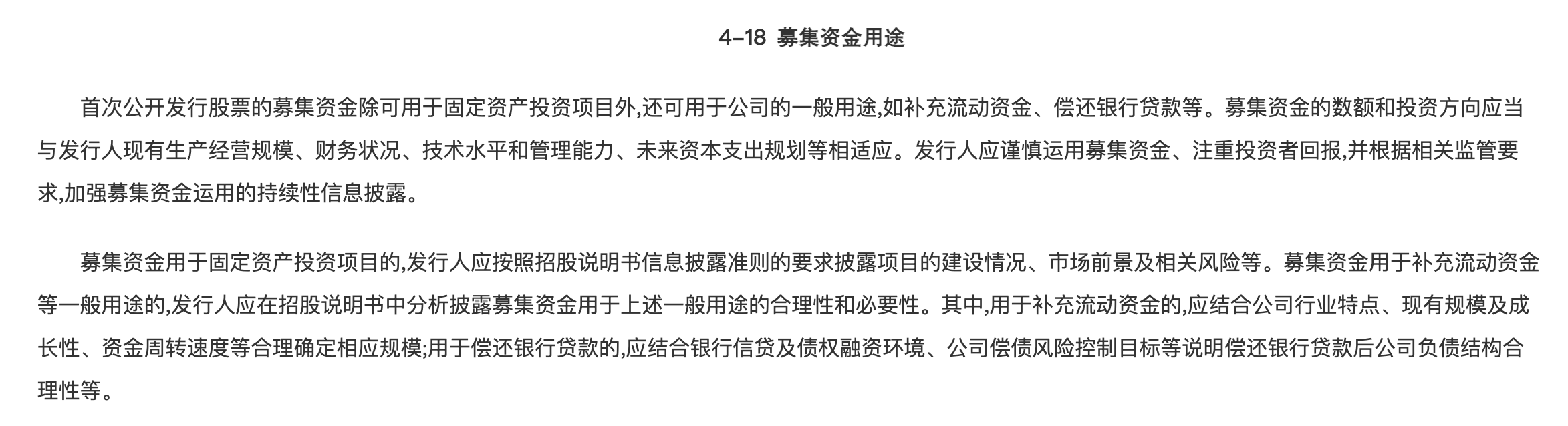 澎湃新闻注意到,全面注册制落地后,证监会发布的《监管规则适用指引——发行类第4号》(简称《发行类第4号》)文件,规定了IPO募集资金用途。《发行类第4号》表示,首次公开发行股票的募集资金除可用于固定资产投资项目,还可用于公司的一般用途,如补充流动资金、偿还银行贷款等;其中,用于偿还银行贷款的,应结合银行信贷及债权融资环境、公司偿债风险控制目标等说明偿还银行贷款后公司负债结构合理性等。