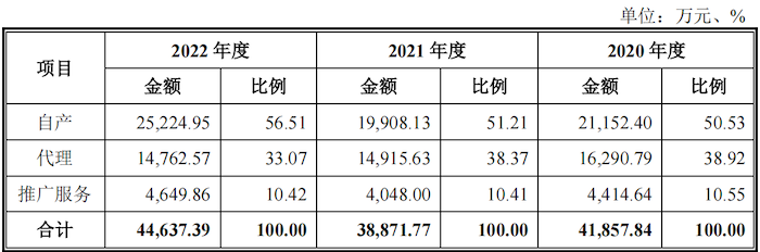 2020年至2022年(报告期),国创医药自产产品收入占比分别为50.53%、51.21%、56.51%,自产产品实现的主营业务收入分别为2.12亿元、1.99亿元和2.52亿元,产品主要为普瑞巴林胶囊、替米沙坦片、益心舒颗粒和颈康胶囊。代理产品收入占比分别为38.92%、38.37%和33.07%,其余为推广服务收入。