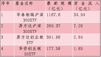 其中,华泰柏瑞沪深300ETF当日增加9.87亿份,至329.77亿份,资金净流入达34.94亿元。易方达沪深300ETF当日增加4.30亿份,至171.08亿份,资金净流入达7.28亿元。此外,易方达创业板ETF、富国上证指数ETF单日“吸金”均超2亿元。