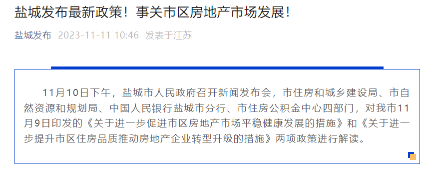11月11日,据“盐城发布”公众号消息,江苏盐城日前印发的《关于进一步促进市区房地产市场平稳健康发展的措施》和《关于进一步提升市区住房品质推动房地产企业转型升级的措施》两项政策。