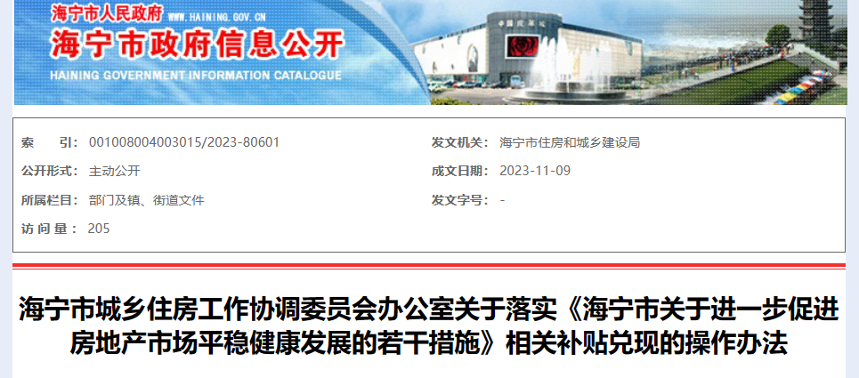 11月9日,浙江海宁发布购房补贴操作办法,包括人才购房补贴、企业或员工团购新建商品房购房补贴、二孩及三孩家庭购房补贴、房地产企业购买存量房财政补贴等。