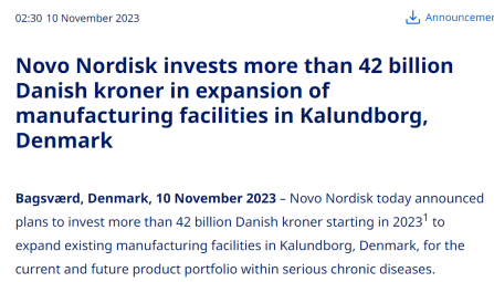 不过令人振奋的是,诺和诺德日前宣布扩产,再次点燃市场热情。诺和诺德表示,计划未来几年投资超过420亿丹麦克朗(约超60亿美元),扩大位于丹麦卡伦堡的现有生产设施,以满足现有及未来的慢性病系列产品的产能需求,这其中就包括GLP-1产品。