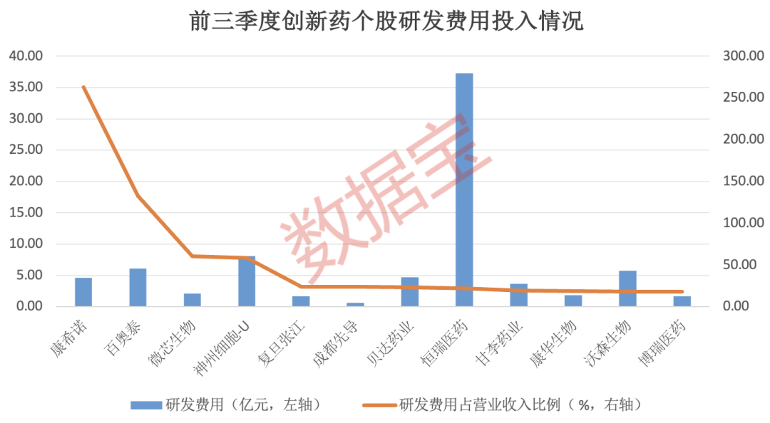 数据宝统计,今年前三季度,研发费用占营业收入比超10%的创新药个股有23只,其中“新冠疫苗第一股”康希诺今年前三季度研发费用达4.62亿元,营业收入为1.76亿元,研发费用占比高达262.86%。