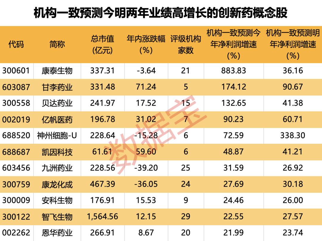 从未来增长潜力来看,根据5家及以上机构一致预测,11只概念股今明两年净利润增速均有望超20%,其中康泰生物、甘李药业、贝达药业今年净利润增速有望翻倍。