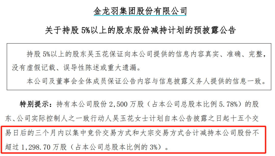 公告称,持有金龙羽股份2500万股(占公司总股本比例5.78%)的股东、公司实际控制人之一致行动人吴玉花女士计划自本公告披露之日起十五个交易日后的三个月内,以集中竞价交易方式和大宗交易方式合计减持公司股份不超过1298.70万股(占本公司总股本比例的3%)。