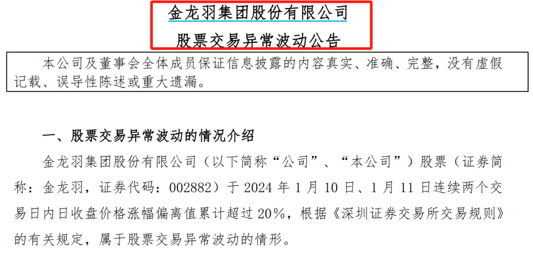 另外,由于股价大涨,金龙羽分别在1月8日、1月11日发布了两份《股票交易异常波动公告》。