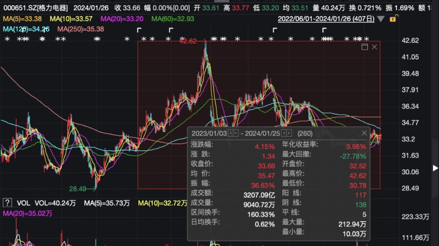 Wind行情数据显示,目前格力股价33.66元/股,自2023年以来累计上涨4.15%,但自2023年高点回撤超20%。