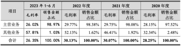 报告期内,公司主营业务毛利率分别为28.15%、29.75%、29.77%和26.02%,总体较为稳定。不过,2023年上半年,公司主营业务毛利率有所下滑,较2022年降低3.75个百分点。