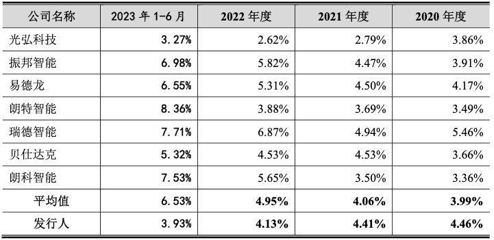 此外,华庄科技最近三年研发费用虽然保持稳定增长,但是研发费用率却有所下降。报告期内,公司研发费用分别为1551万元、2144.50万元、2592.45万元和1163.65万元,公司研发费用呈增长趋势。然而,2022年度、2023年1-6月由于收入增长较快,规模效应扩大,导致研发费用率下降,低于同行业可比公司平均水平。