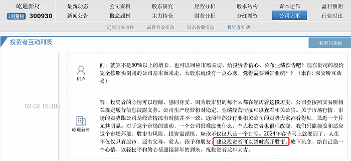 对于投资者的“吐槽”,公司回应称:“投资者的心情可以理解,感同身受,因为股市里的每个人都在经历着这段历史。公司会按照交易所相关规定履行信息披露义务。公司生产经营相对稳定,业绩经营情况可以查看相关公告。关于市场行情,市场的走势跟公司是经营情况有时候并不一致。近两年部分行业相关公司的走势大家都看得见,最近一个月尤其明显。对于这个市场的波动,一个公司很难改变什么,个人投资者也很难改变,我们只能接受和适应这个市场环境。股市有风险,投资需谨慎,应该不仅仅只是一个口号。2024年春节马上就要到了,人生不仅仅只有股市,还有父母、爱人、孩子和朋友,建议投资者可以暂时离开股市,放下执念,给自己换一个心情,以轻松平和的心情迎接新年的到来。祝投资者龙年大吉。”