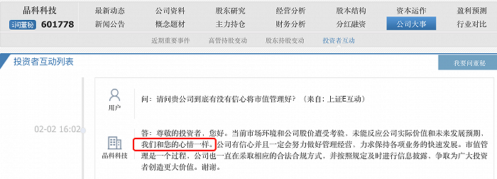 晶科科技(601778.SH)也有同样遭遇。有投资者在互动平台上问“公司到底有没有信心将市值管理好?”